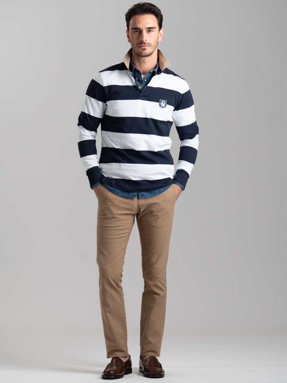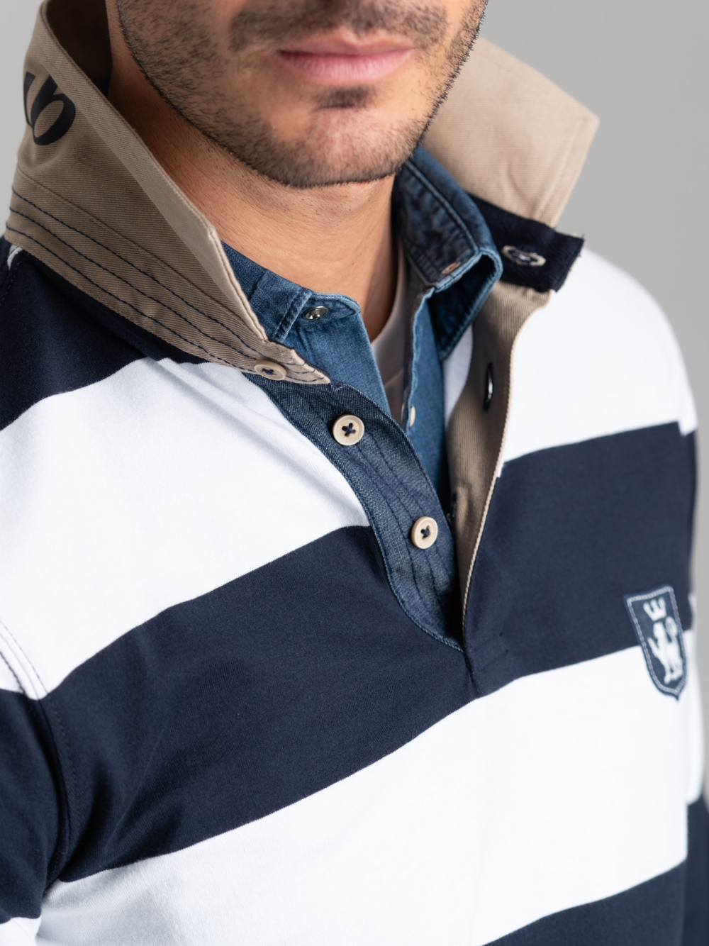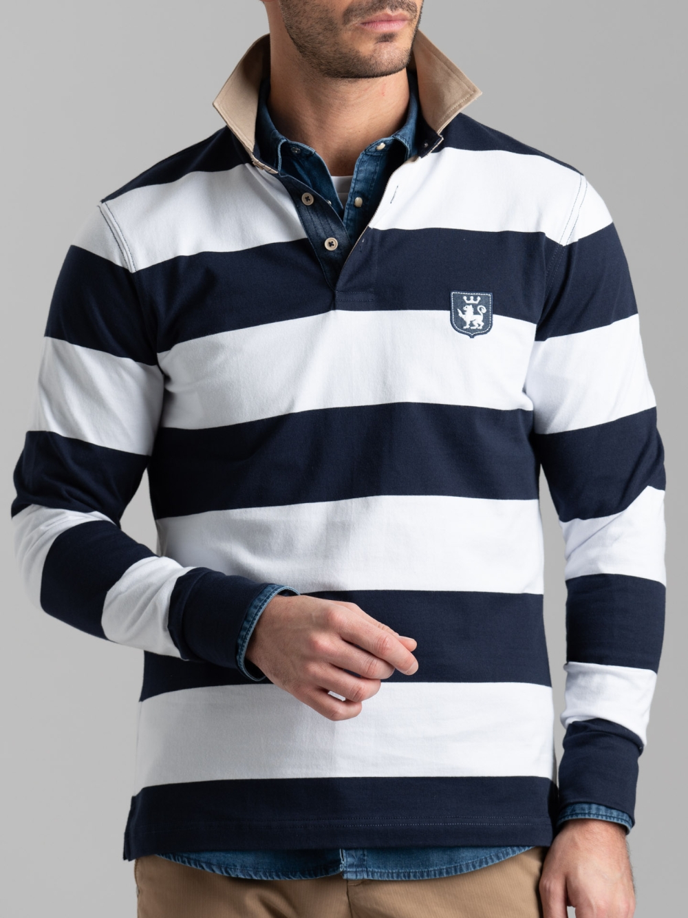 Polo uomo a manica lunga realizzata in jersey di cotone fantasia rigatore con collo e interno lista a contrasto in tessuto twill beige. La polo presenta una stampa gommata nel sottocollo, canolo effetto denim con impunture, nastro spigato nell’interno collo, logo Invidia 1973 patch a forma di scudo e spacchetto laterale rifinito con nastro interno. Disponibile in due varianti colore: blu-bianco e blu chiaro-verde militare.