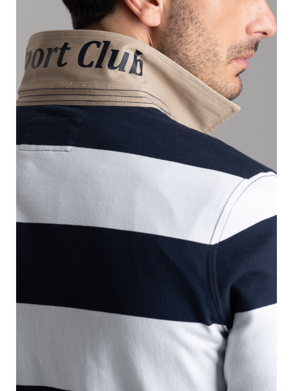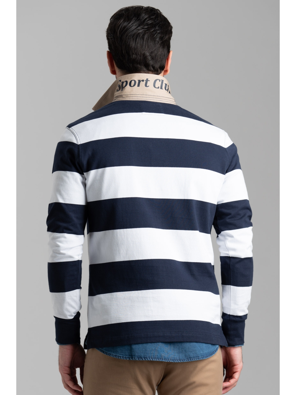 Polo uomo in jersey di cotone fantasia rigatore con collo e interno lista a contrasto in tessuto twill beige a manica lunga.