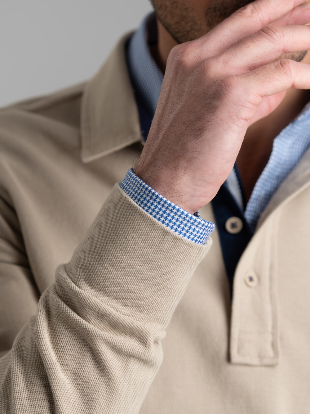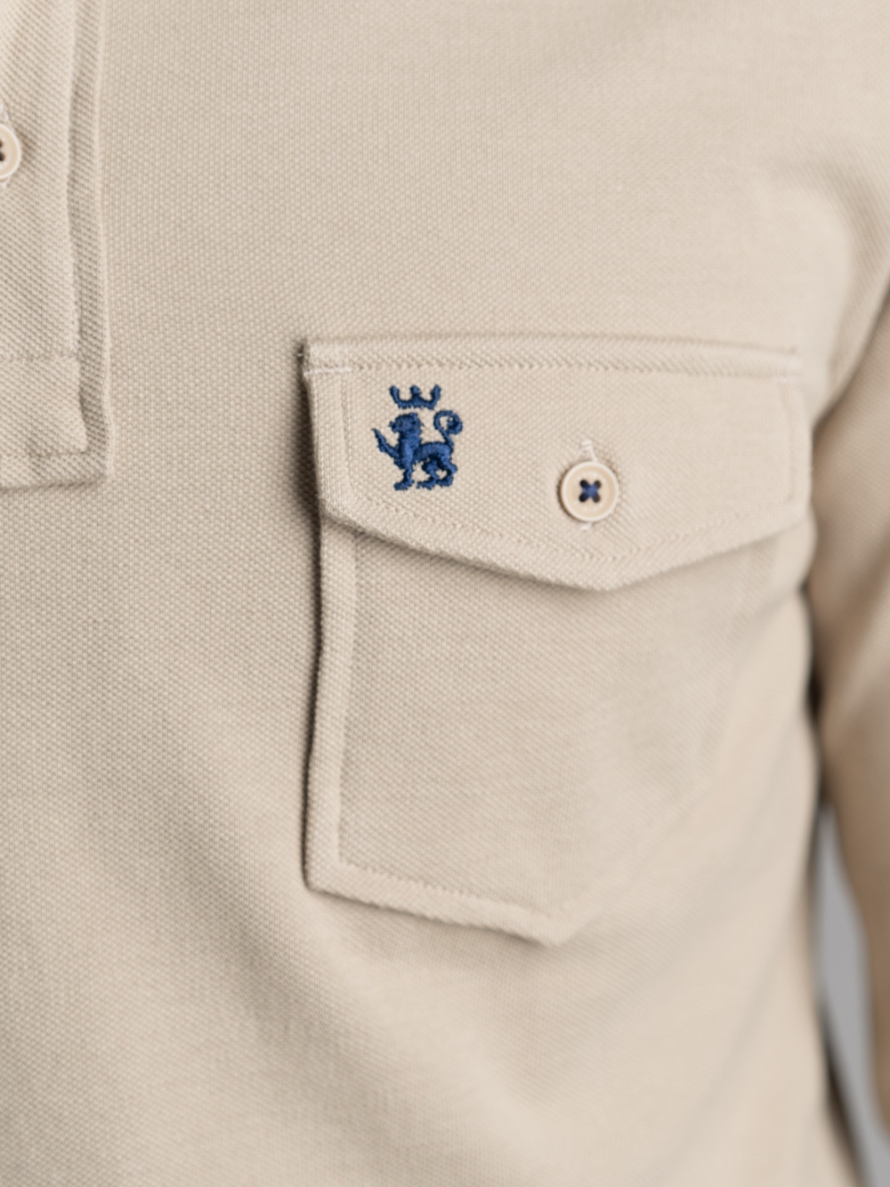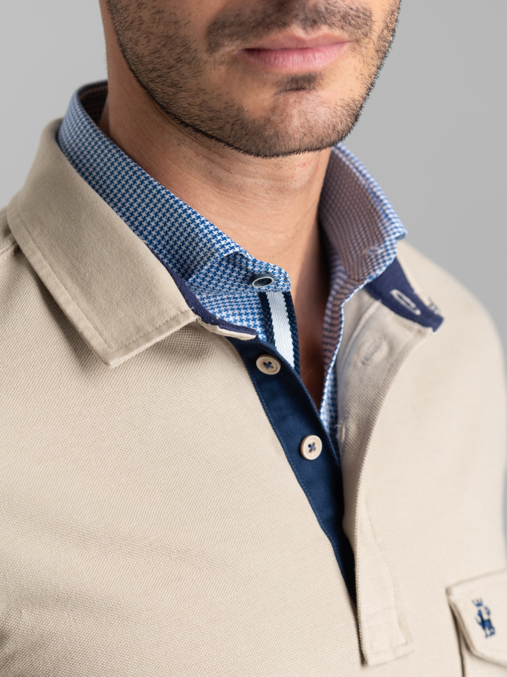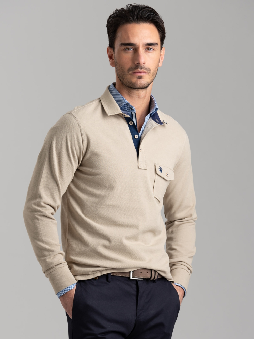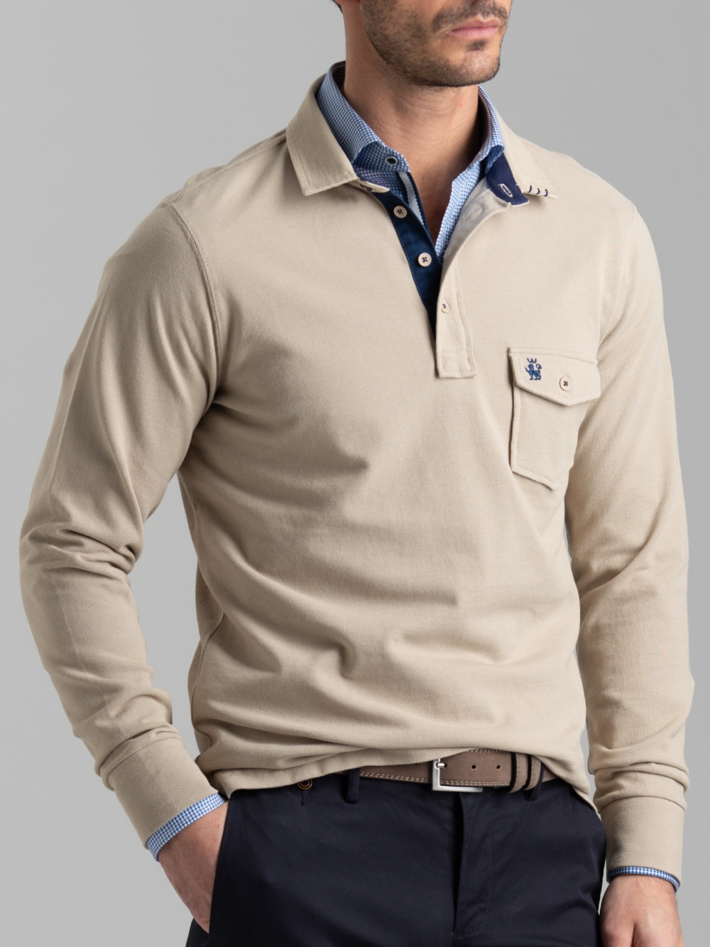 Polo uomo a manica lunga realizzata in cotone piquet nelle varianti blu, sabbia e verde militare. La polo è caratterizzata da un taschino applicato con patella e logo Invidia 1973 ricamato. Il collo è in tessuto twill tinta unita con puntoni fatti a mano. Sono presenti un nastro a contrasto nell’interno collo e lungo il canolo bottoni, e uno spacchetto laterale rifinito con nastro.