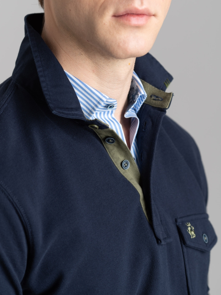 Polo uomo in cotone piquet a tinta unita e manica lunga con taschino applicato, collo in twill con puntoni e inserti a contrasto.