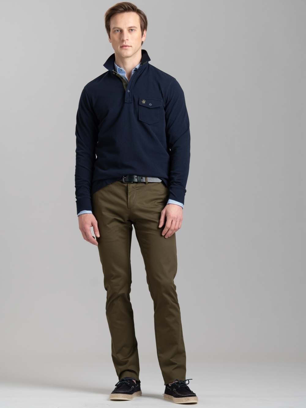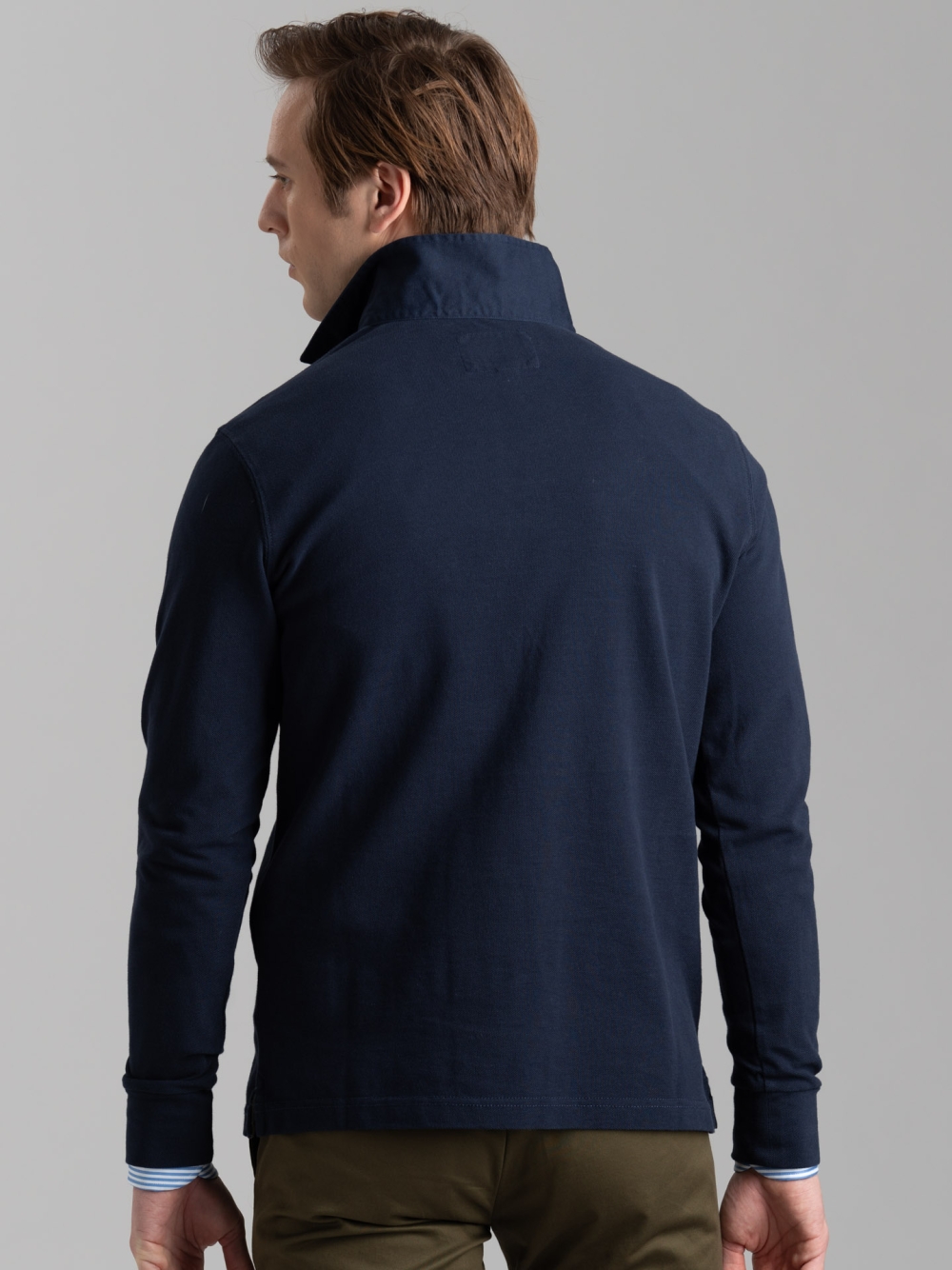Polo uomo a manica lunga realizzata in cotone piquet nelle varianti blu, sabbia e verde militare. La polo è caratterizzata da un taschino applicato con patella e logo Invidia 1973 ricamato. Il collo è in tessuto twill tinta unita con puntoni fatti a mano. Sono presenti un nastro a contrasto nell’interno collo e lungo il canolo bottoni, e uno spacchetto laterale rifinito con nastro.