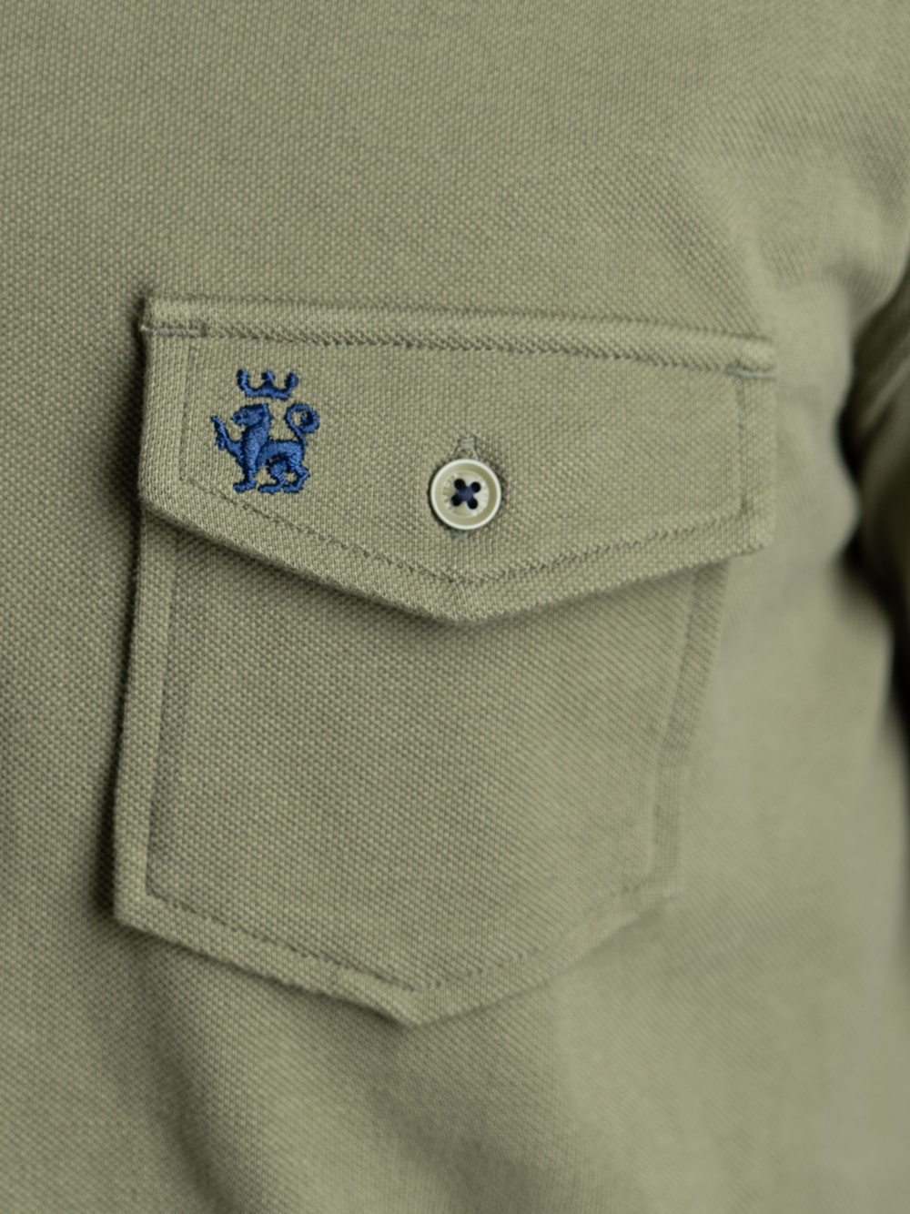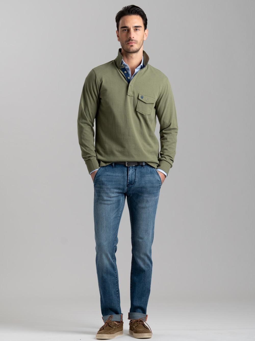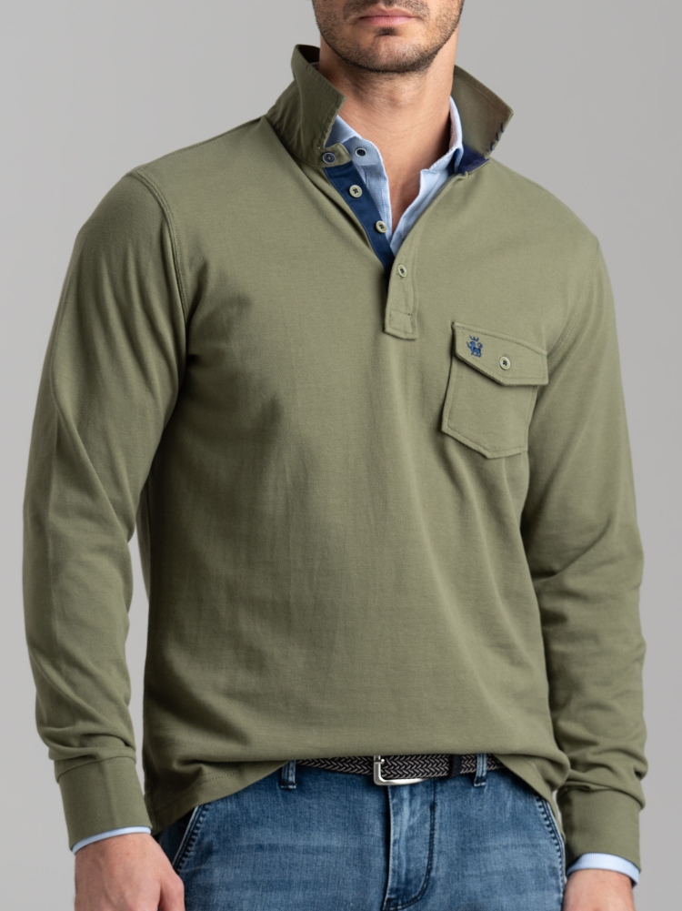 Polo uomo a manica lunga realizzata in cotone piquet nelle varianti blu, sabbia e verde militare. La polo è caratterizzata da un taschino applicato con patella e logo Invidia 1973 ricamato. Il collo è in tessuto twill tinta unita con puntoni fatti a mano. Sono presenti un nastro a contrasto nell’interno collo e lungo il canolo bottoni, e uno spacchetto laterale rifinito con nastro.
