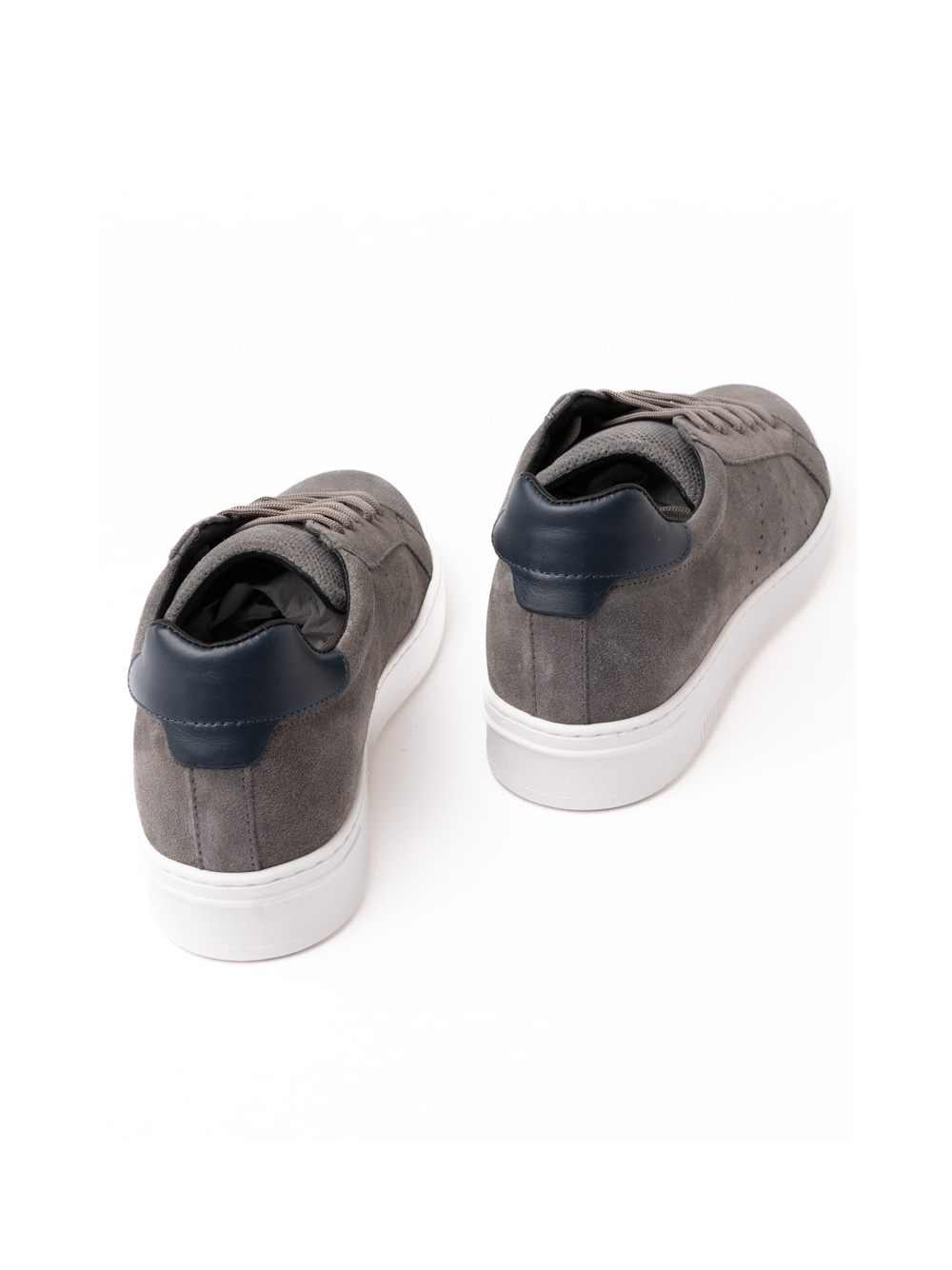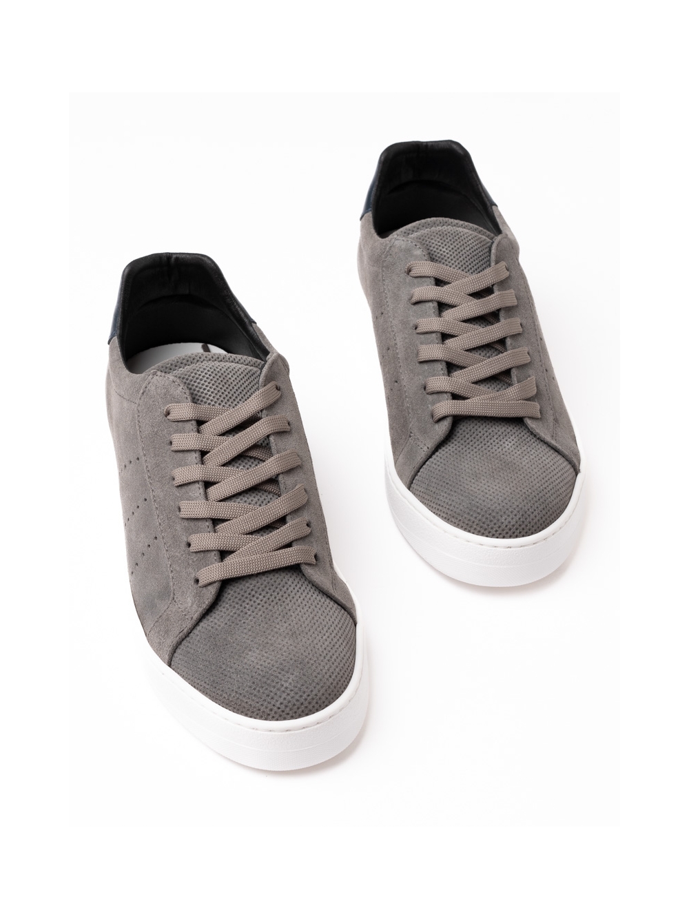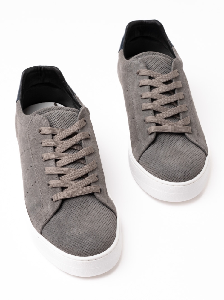 Scarpa uomo modello sneaker realizzata in camoscio liscio e camoscio traforato sui lati, la linguetta e la punta. Con un rinforzo sul tallone, questa scarpa uomo stringata è caratterizzata da una suola bianca che dona un effetto contemporaneo. Modello disponibile nelle varianti colore grigio e cammello.
