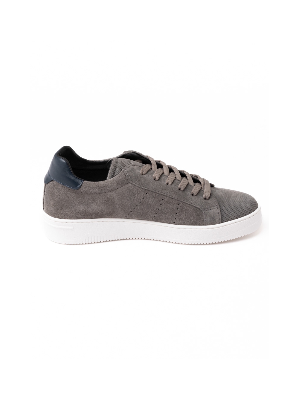 Sneaker uomo in camoscio liscio e traforato, con suola bianca.