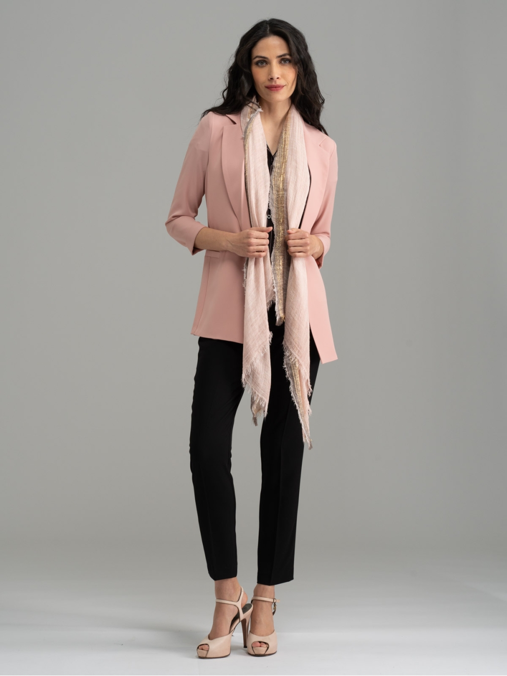 Sciarpa donna in tessuto leggero effetto viscosa, color rosa cipria con profili in lamina lurex oro.