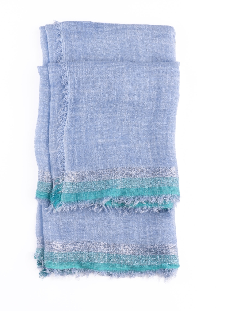 Sciarpa donna con frange realizzata in tessuto misto lino e viscosa tinta unita con bordi in lurex, disponibile in tre varianti colore: bianco con bordo in lurex argento e rosa, sabbia con bordo in lurex tortora, azzurro con bordo lurex argento e verde acqua.