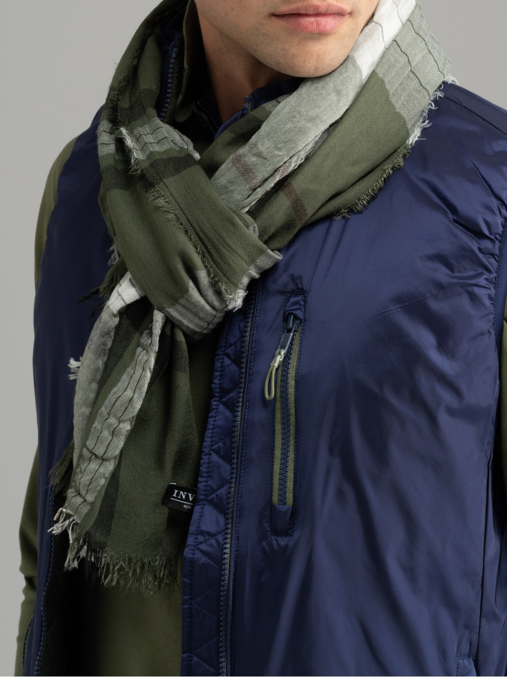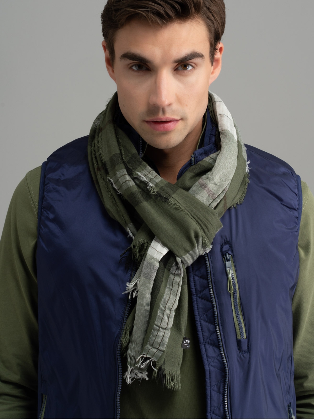 Sciarpa uomo in tessuto misto viscosa stropicciato con disegno madras monocromatico verde militare.