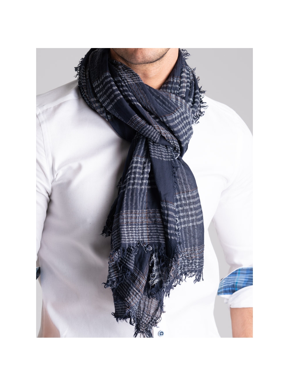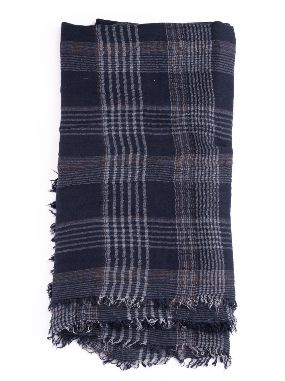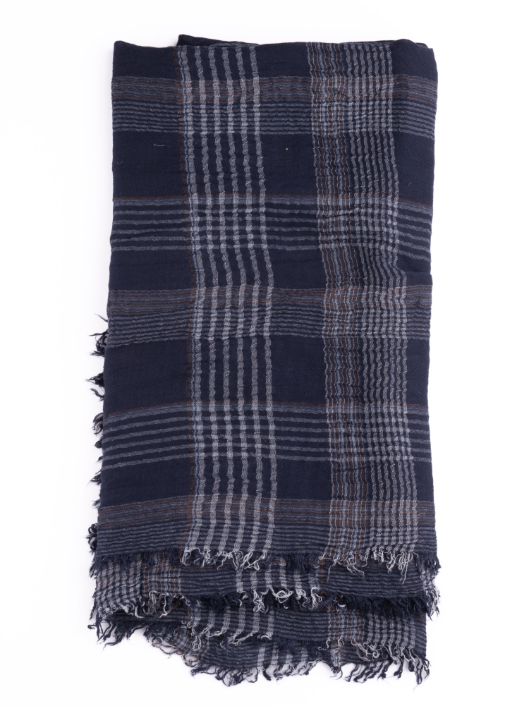 Sciarpa uomo in cotone con fantasia madras nei toni del blu e del bianco con tocchi di marrone e frange sul fondo.