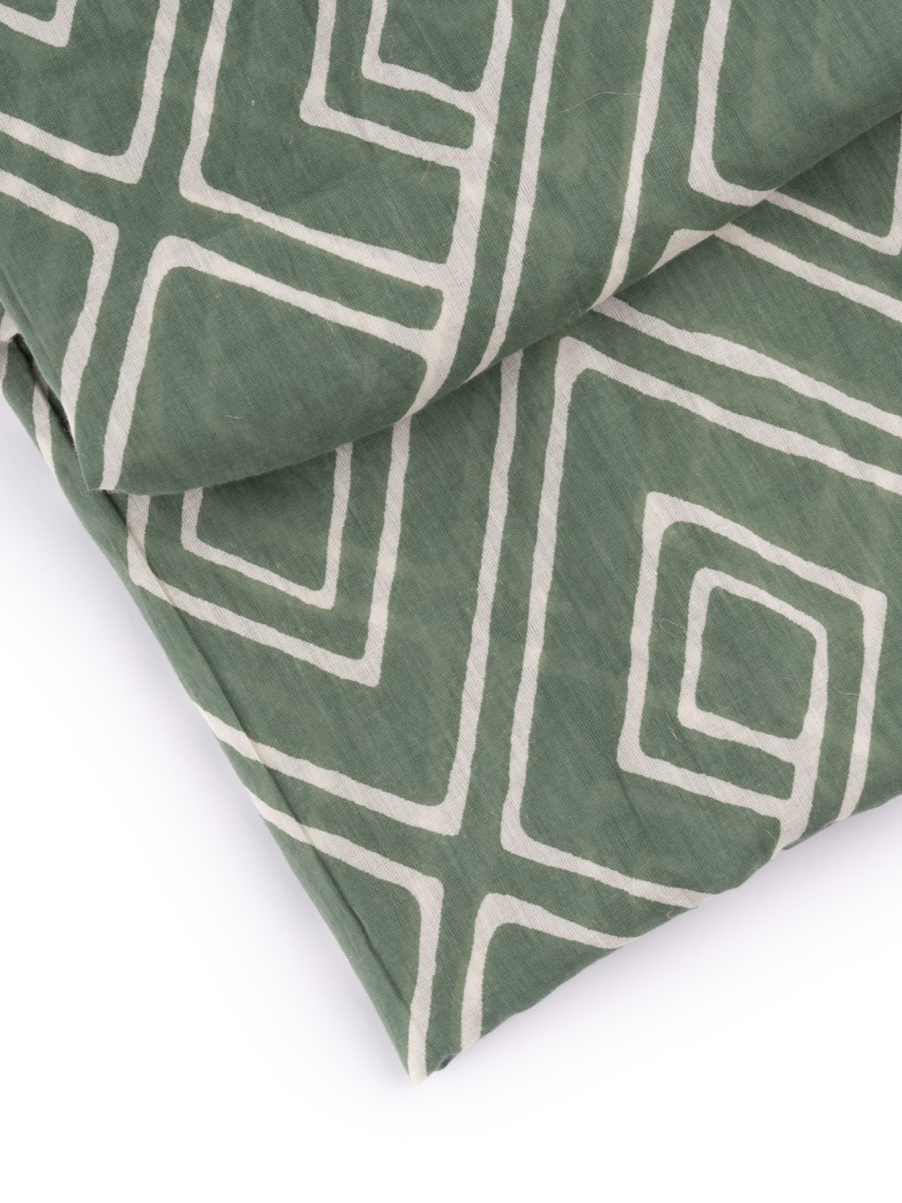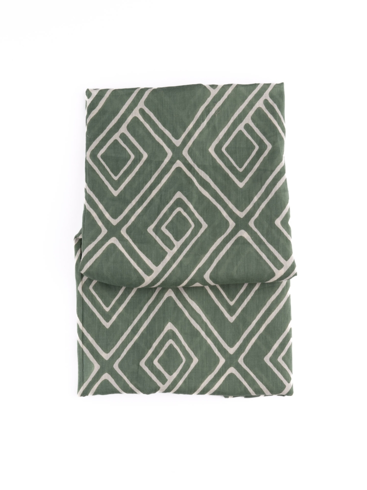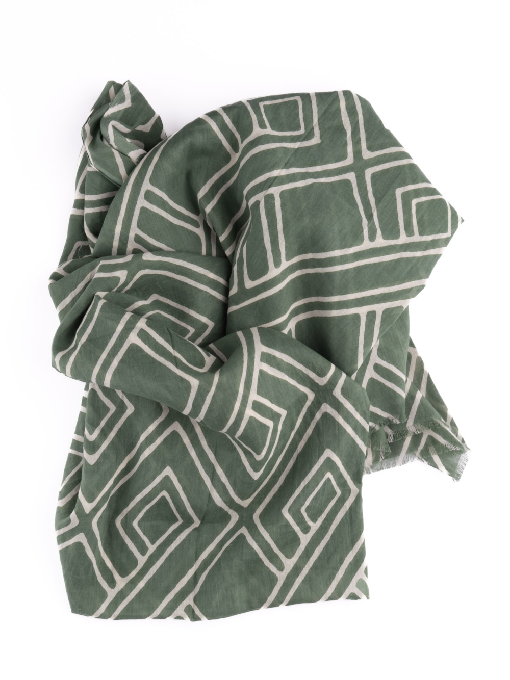 Sciarpa uomo in cotone caratterizzata da una stampa geometrica con disegno rombo irregolare, sfrangiata, disponibile nelle varianti verde e sabbia.