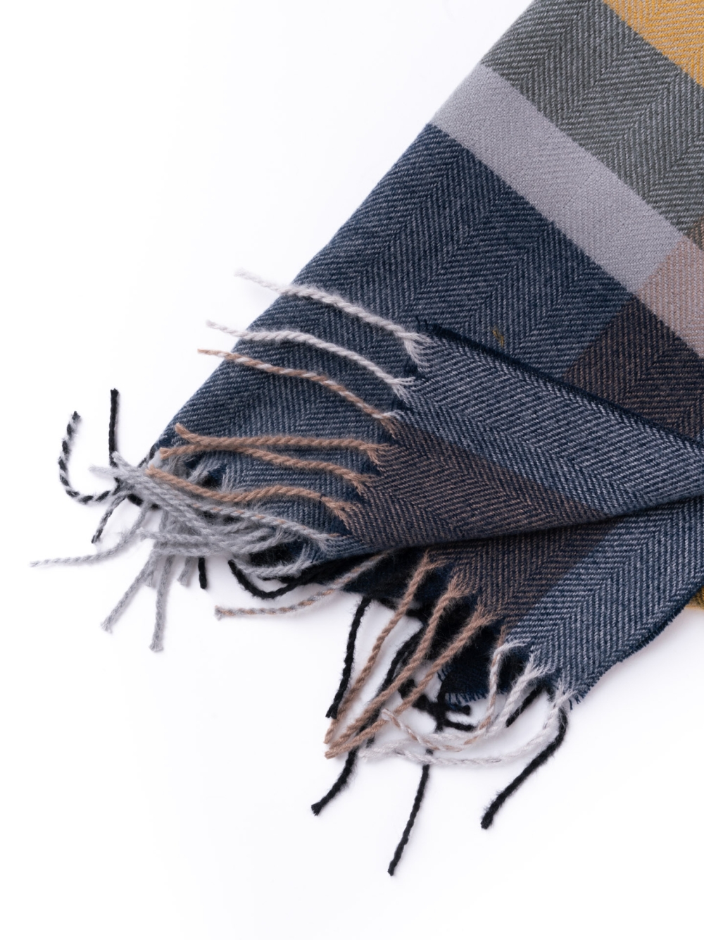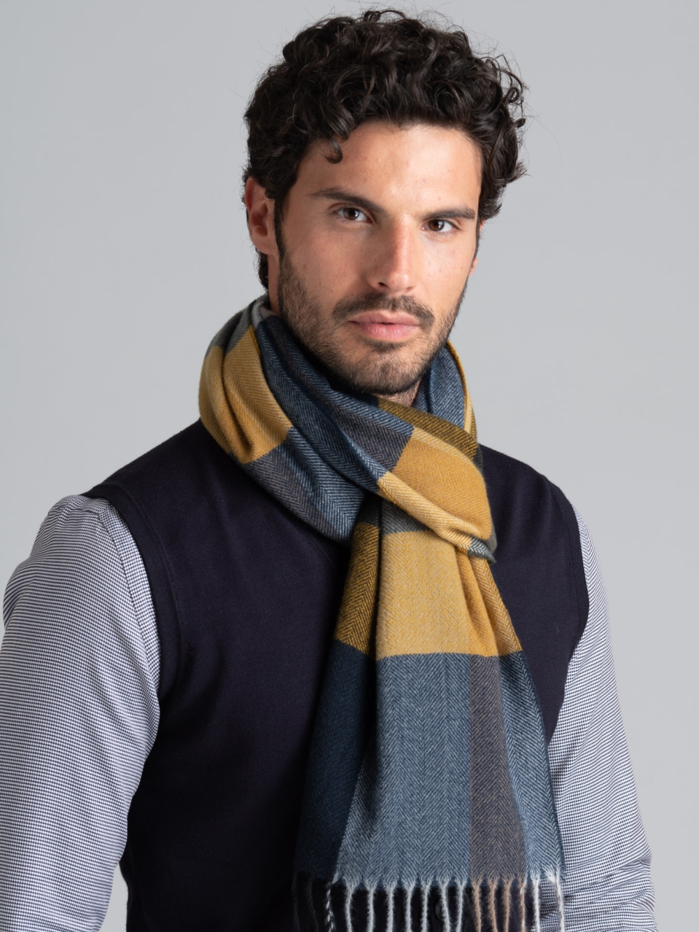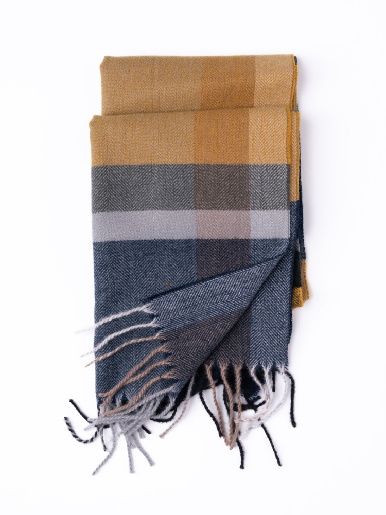 La sciarpa uomo con stampa madras e frange è realizzata in tessuto base spigato e mano calda nei toni del blu, verde e senape.