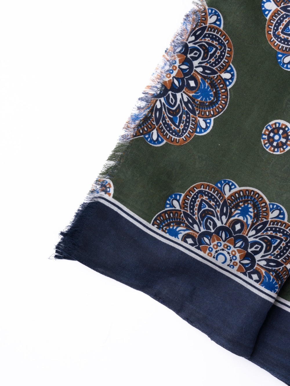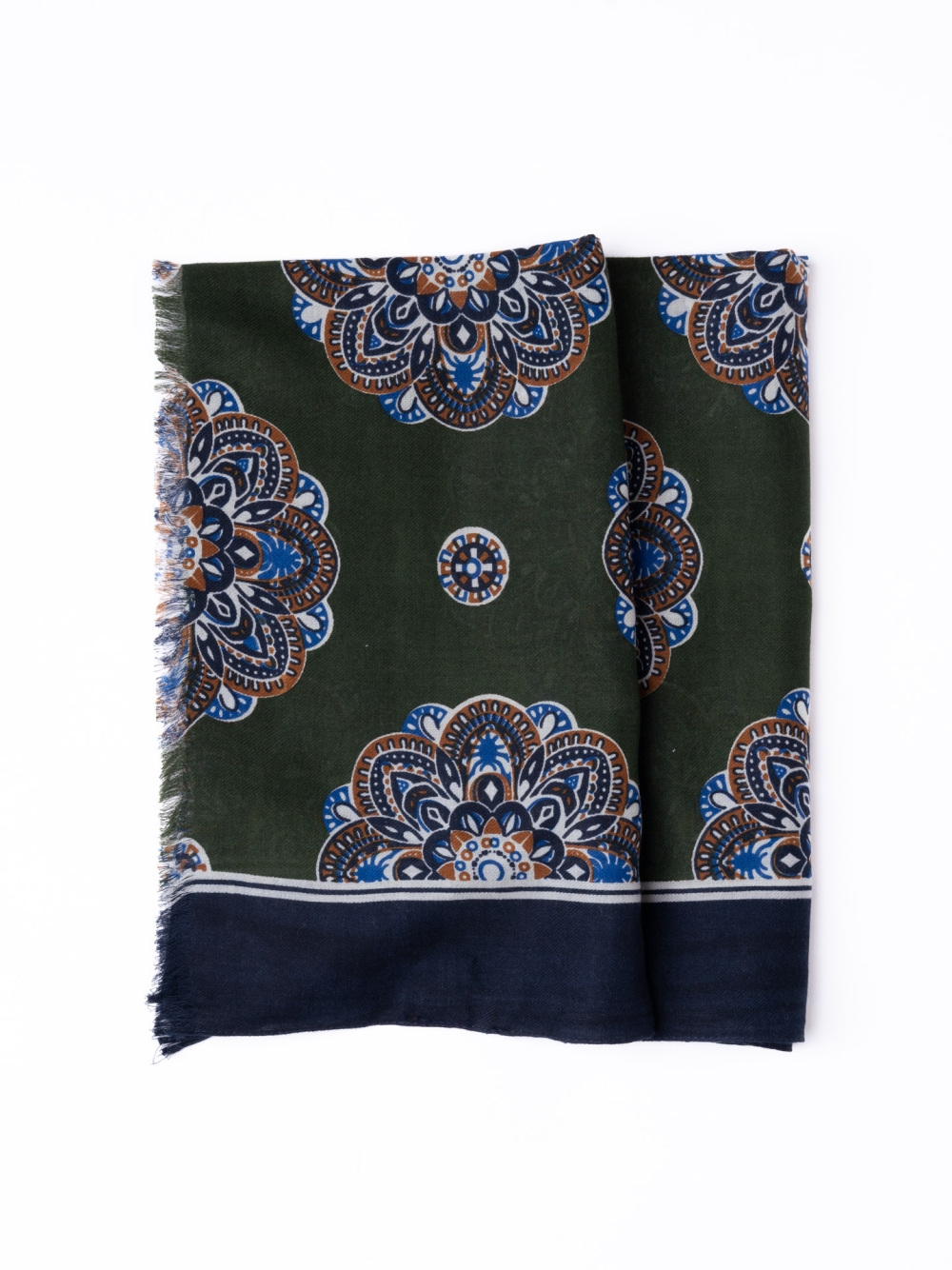 Sciarpa uomo realizzata in leggero tessuto di cotone con micro frange, caratterizzata da una stampa cashmere e bande a contrasto nei toni del blu, panna e verde.
