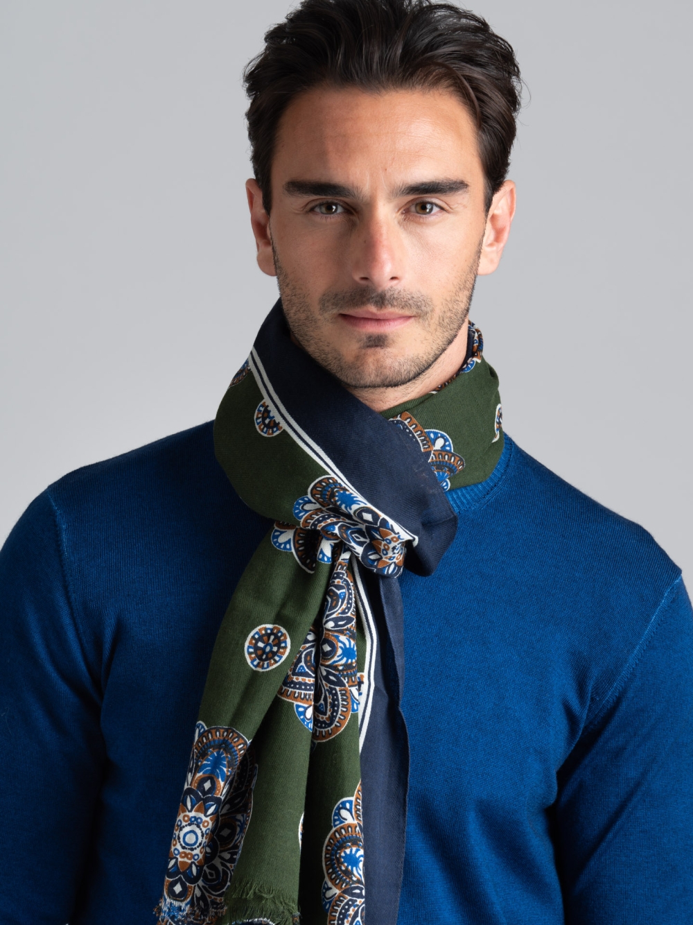 Sciarpa uomo stampa disegno cashmire con bande a contrasto