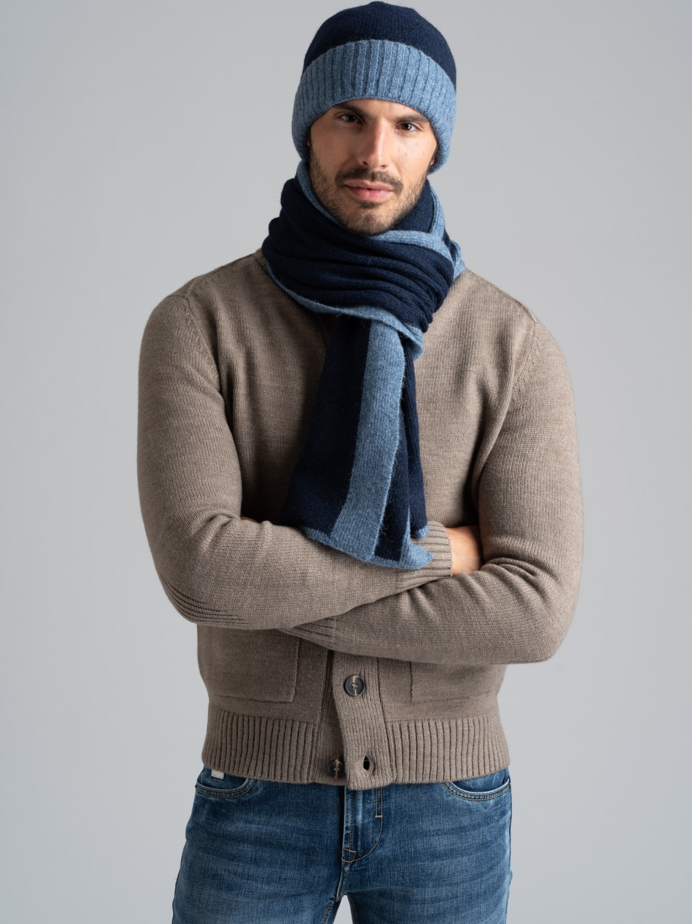 Sciarpa uomo in tessuto misto lana smacchinata con bordi a contrasto, abbinabile al cappellino.