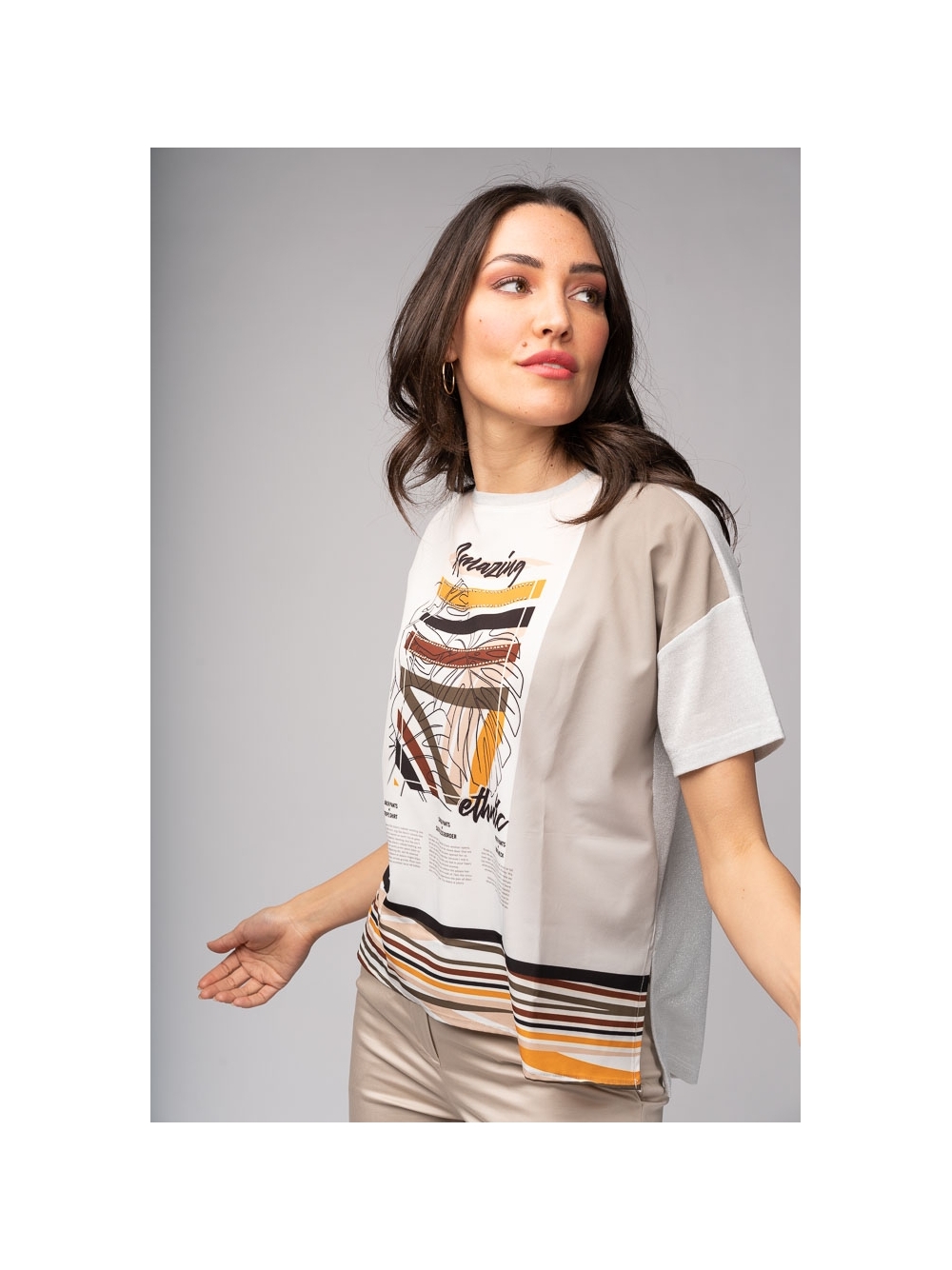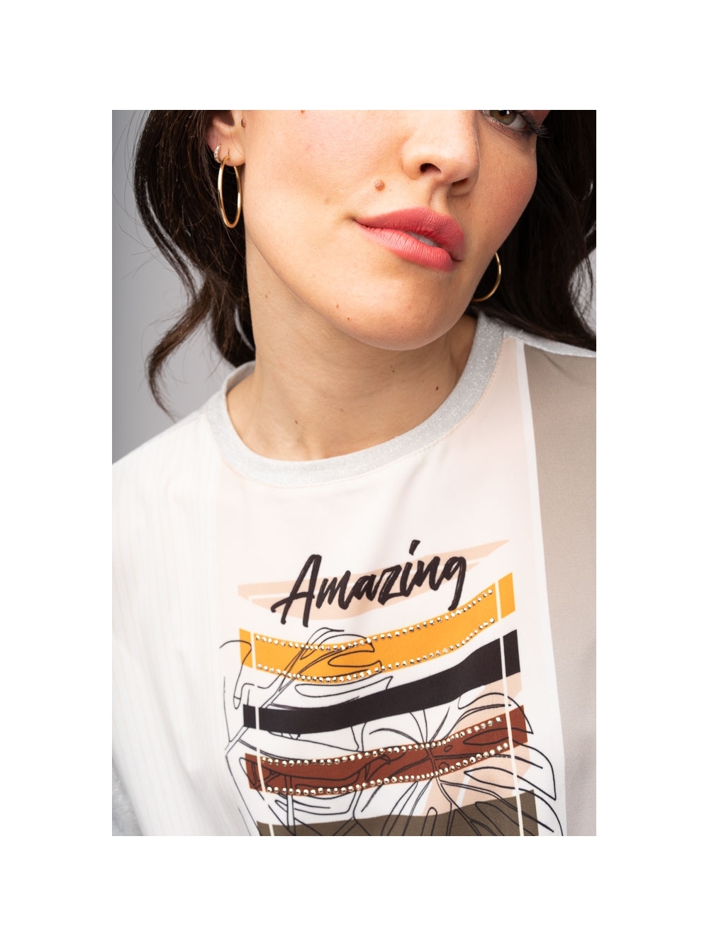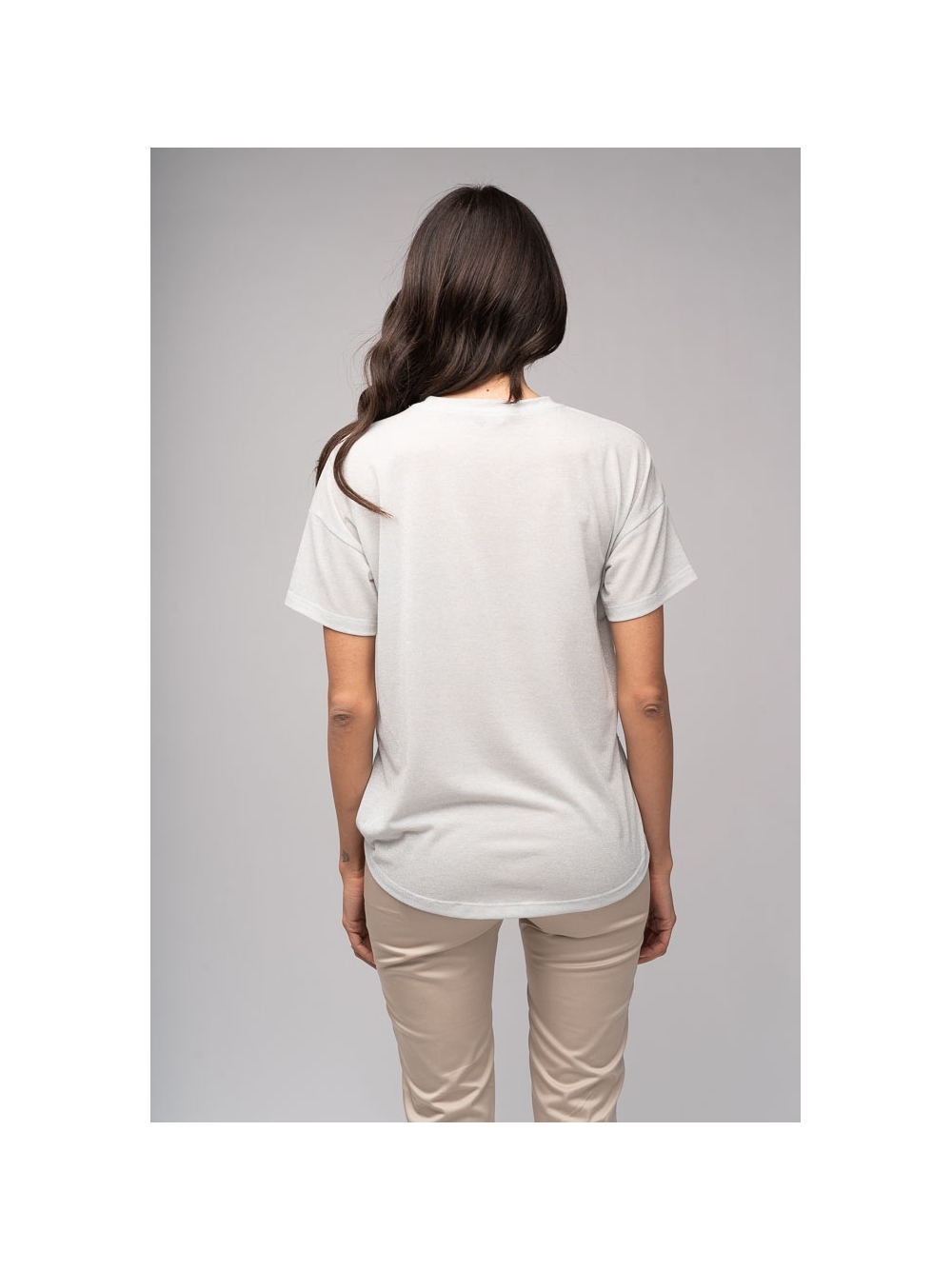 T-shirt donna dalla linea over con stampa d'ispirazione retrò davanti e applicazioni di strass. La parte posteriore realizzata in tessuto lamè rende questo capo luminoso su ogni outfit
