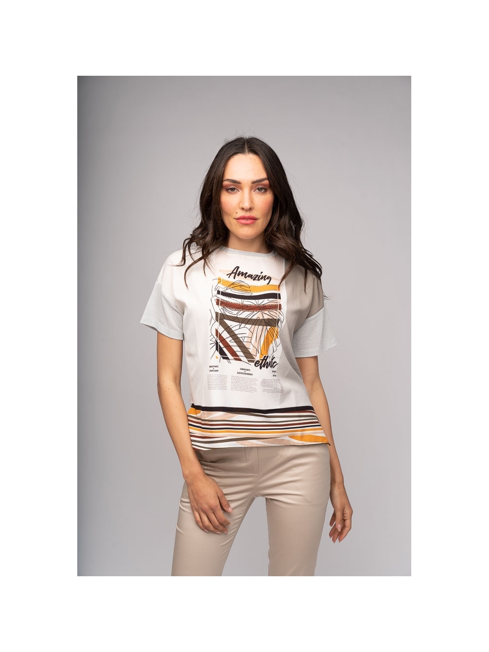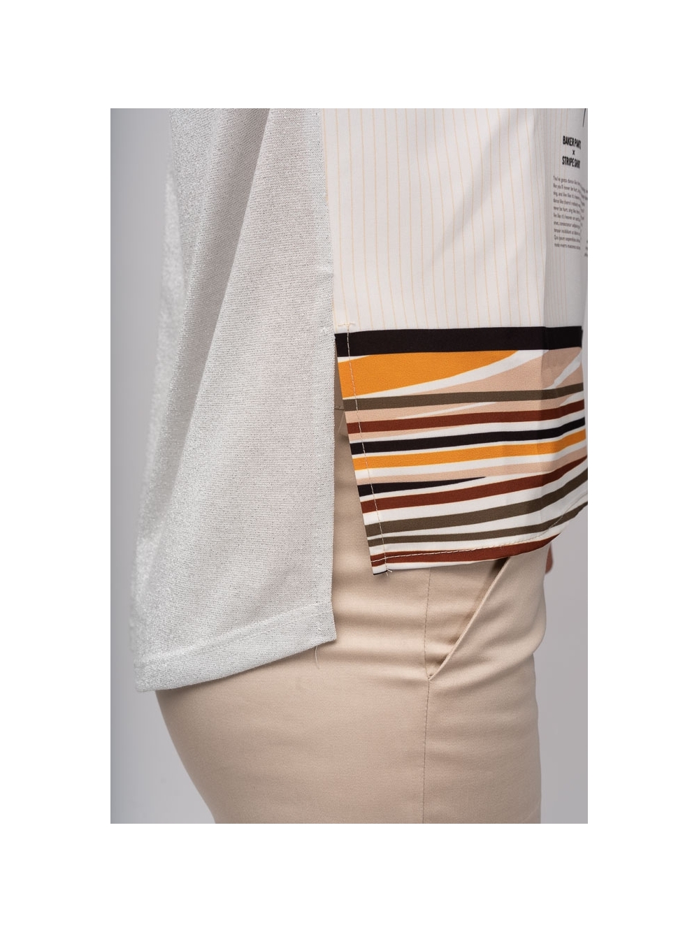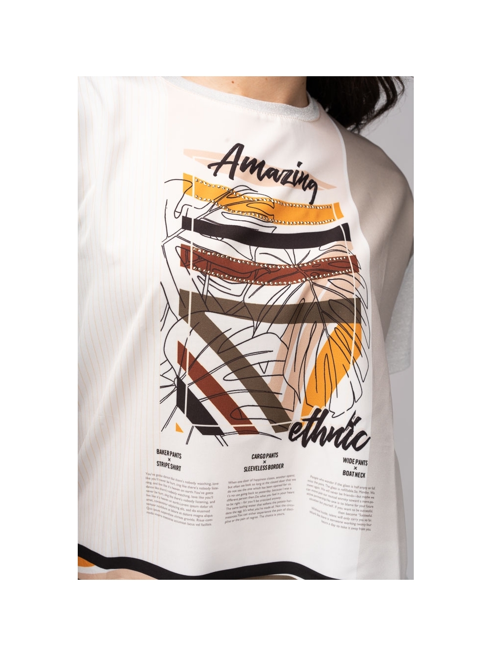 T-shirt donna dalla linea over con stampa d'ispirazione retrò davanti e applicazioni di strass. La parte posteriore realizzata in tessuto lamè rende questo capo luminoso su ogni outfit