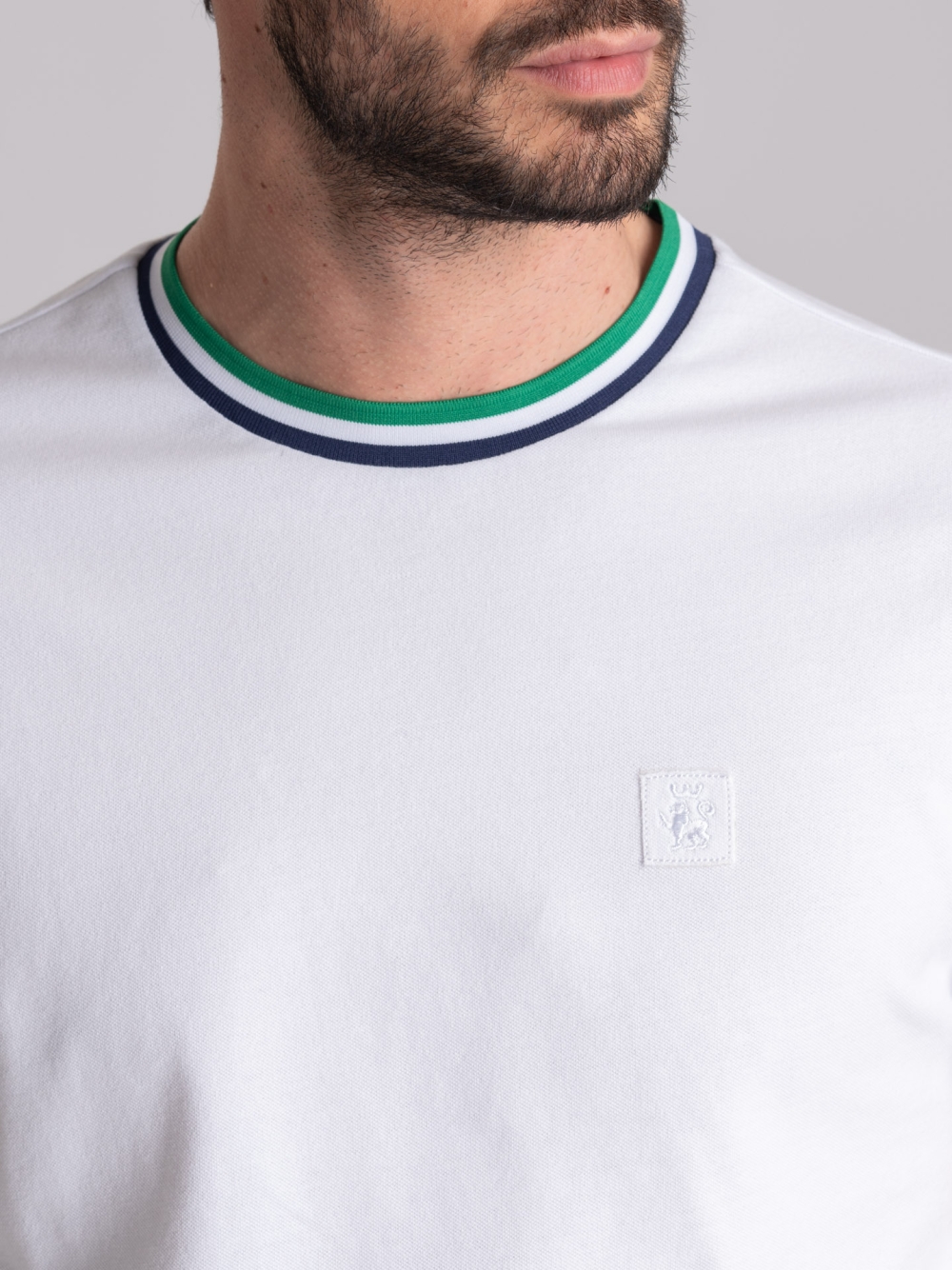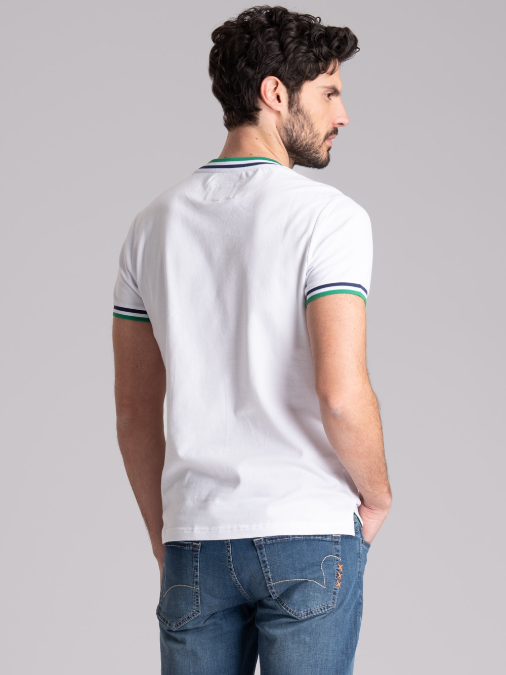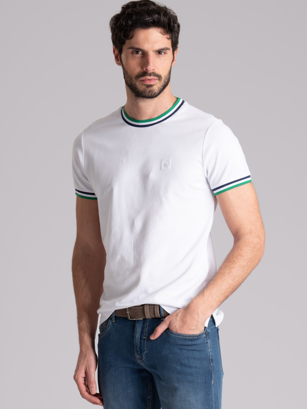 T-shirt uomo girocollo a mezza manica, realizzata in tessuto di cotone tinta unita con dettagli a contrasto sul collo e la manica.
