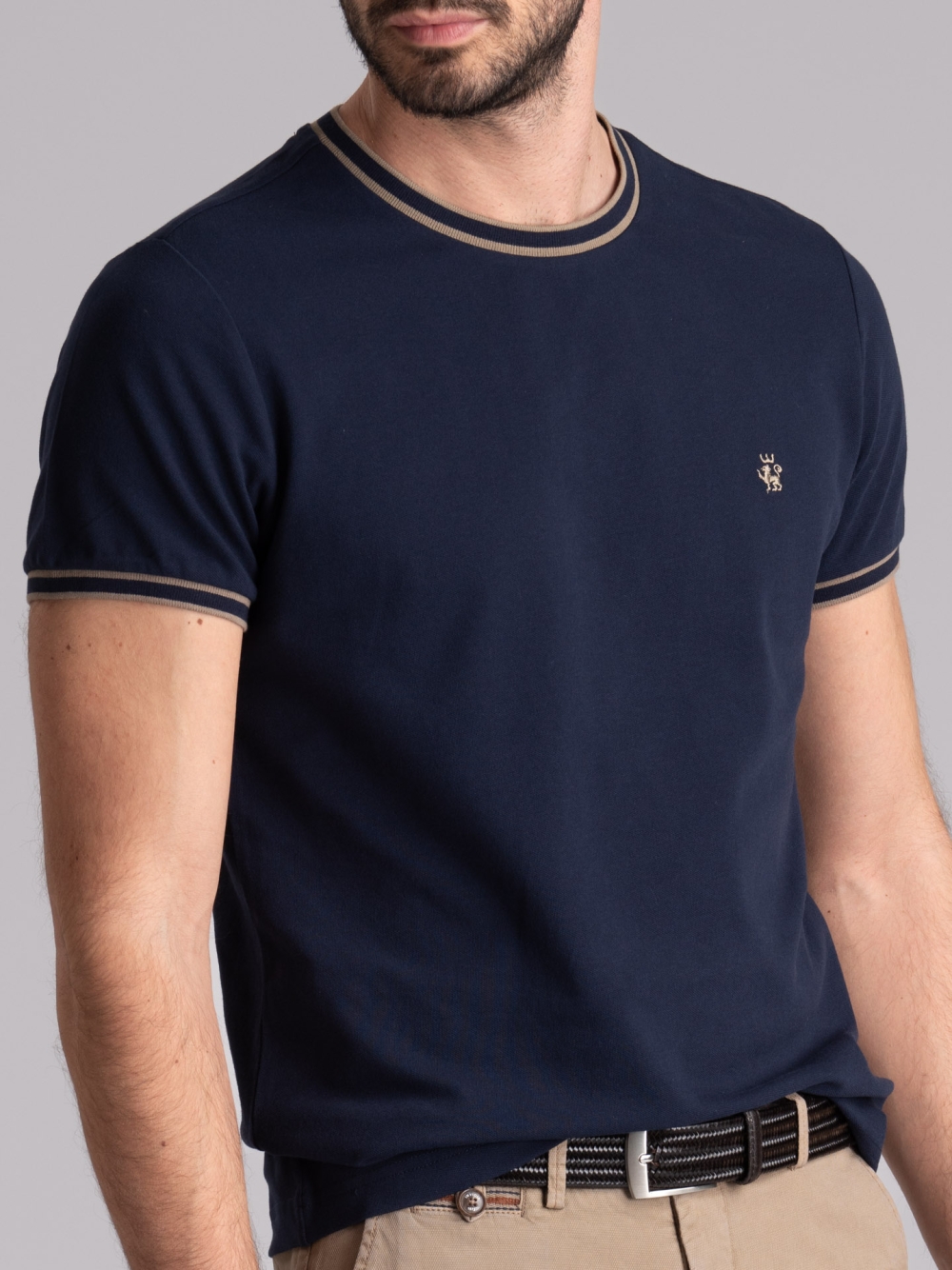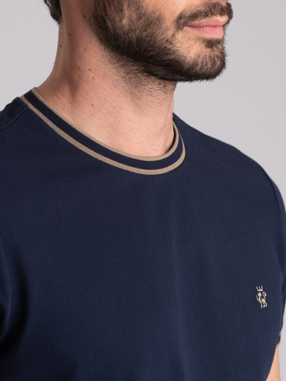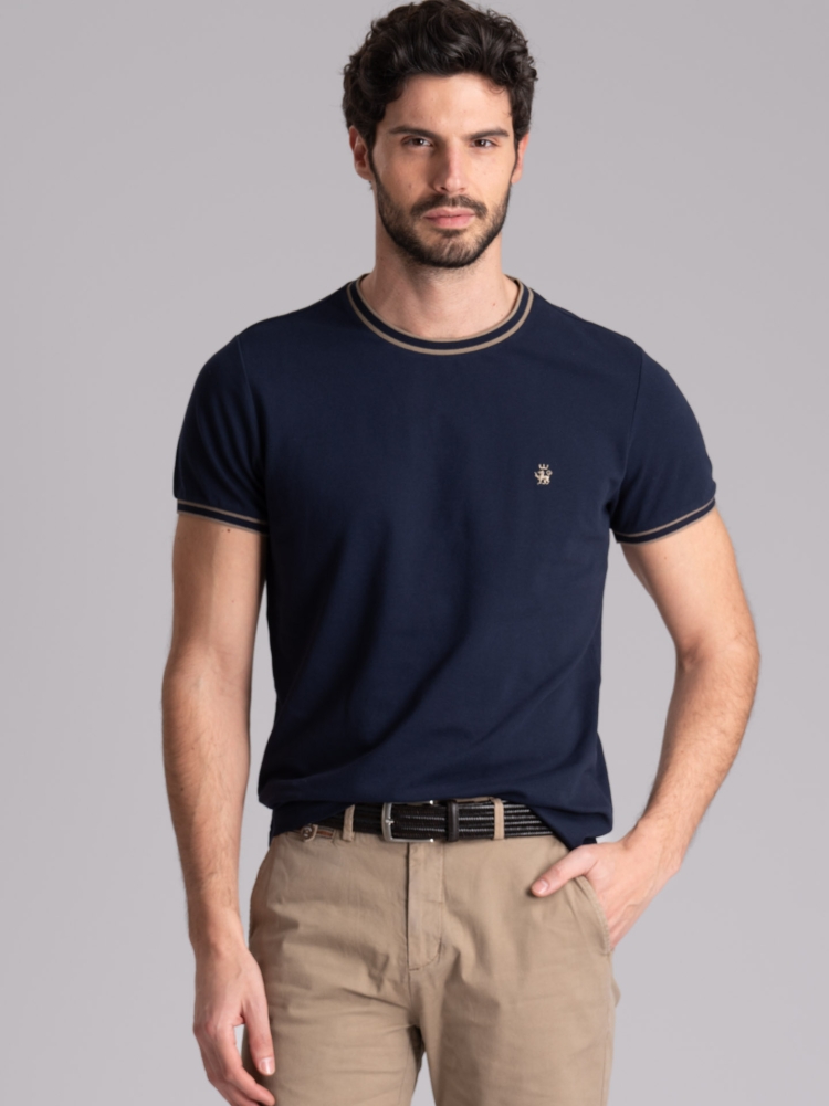 T-shirt uomo mezza manica realizzata in tessuto di cotone tinta unita con dettagli a contrasto sul collo e la manica.