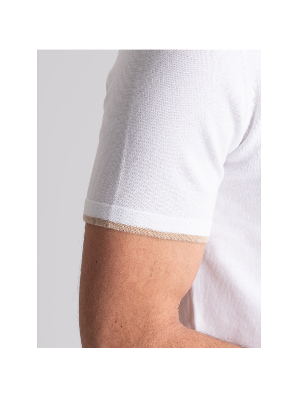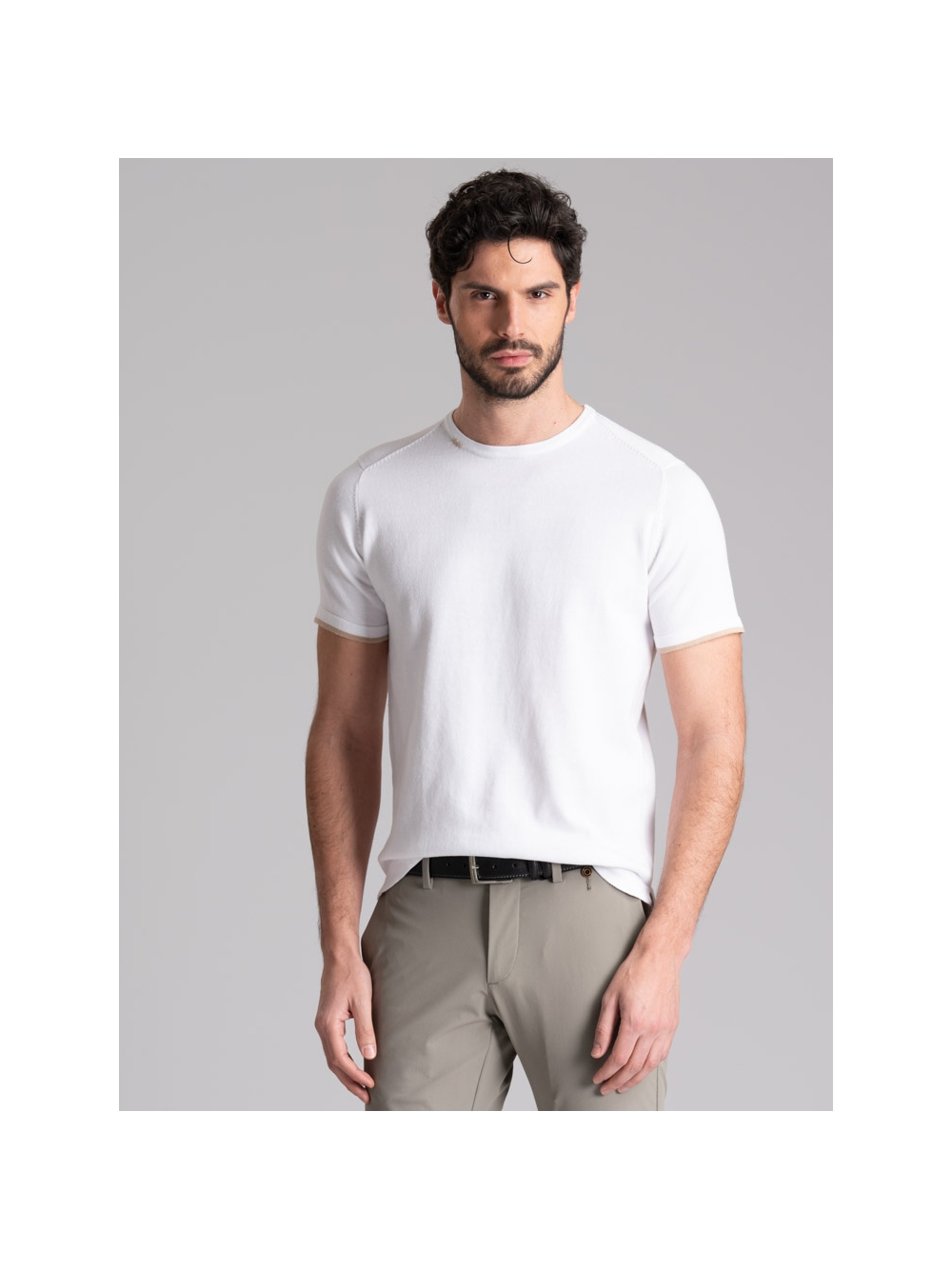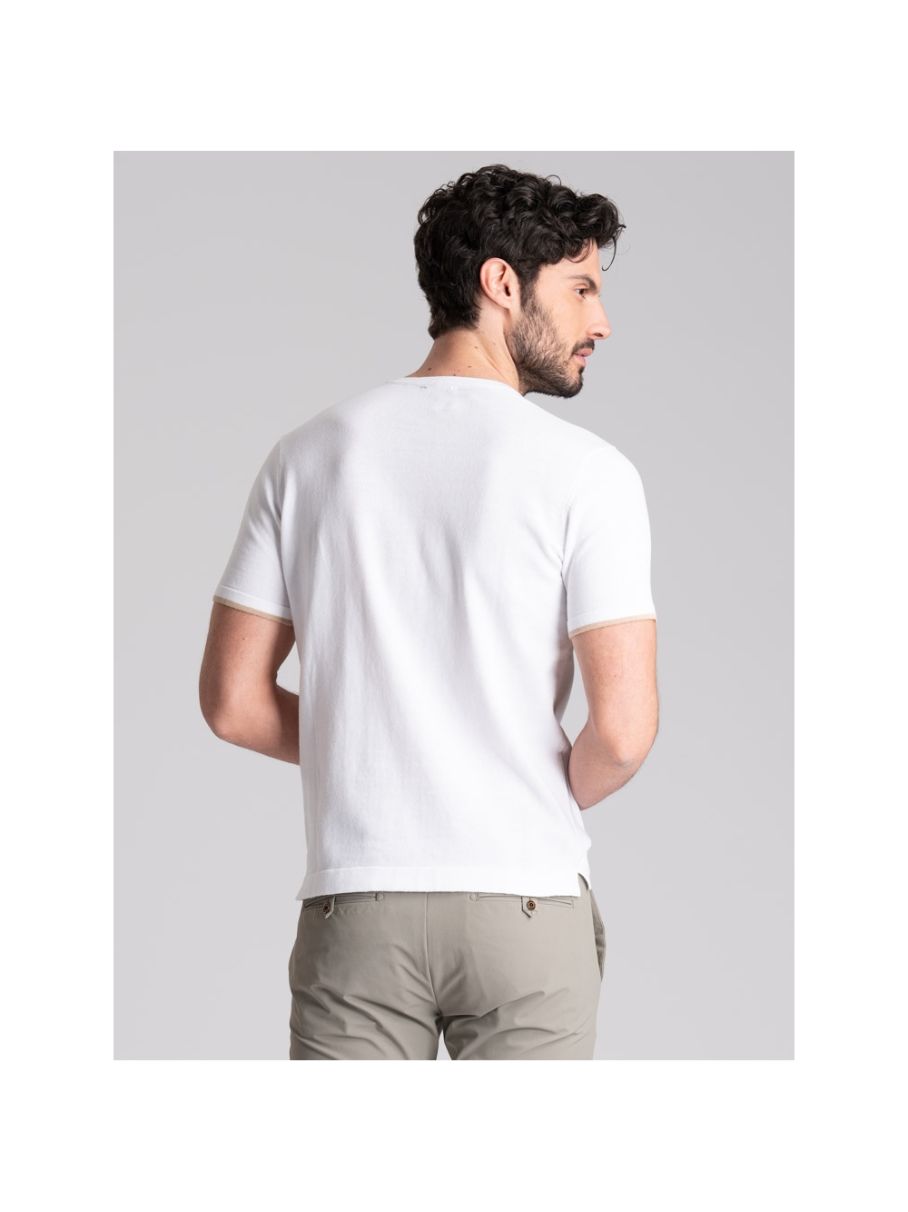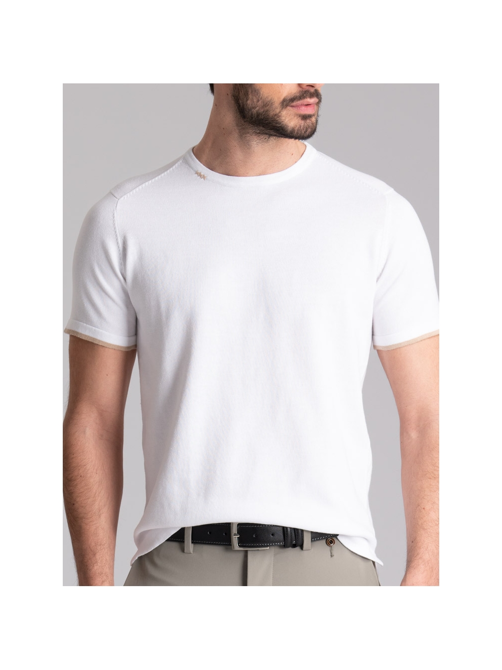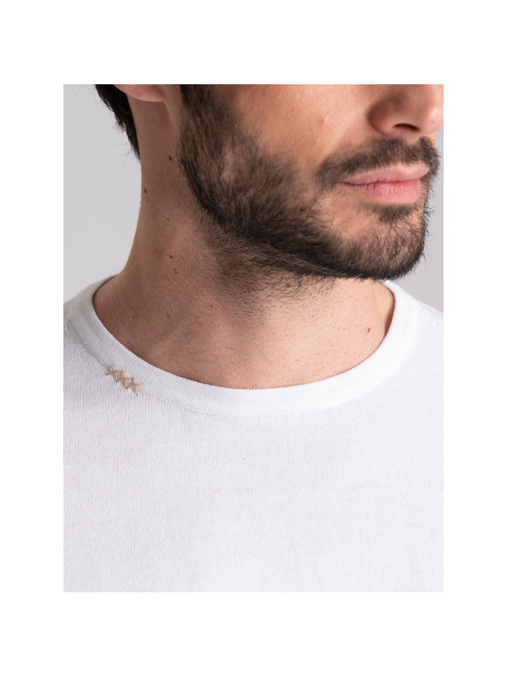 T-shirt uomo realizzata in maglia rasata 100% cotone finezza 12 a mezza manica. Questa t-shirt tinta unita nelle varianti blu e bianco, presenta raffinate righe a contrasto colore sul collo e i polsini delle maniche, oltre a crocette ricamate a mano sul collo. Il modello è ideale per una moda uomo casual raffinata da indossare anche in città.
