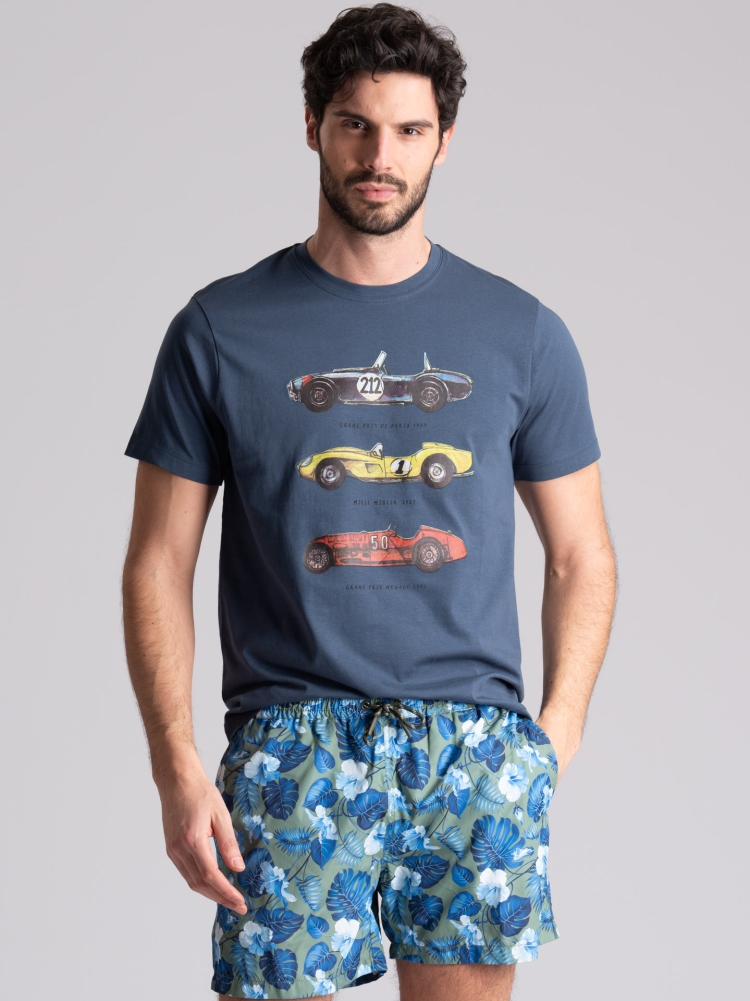 T-shirt uomo girocollo modello mezza manica, realizzata in fresco tessuto jersey 100% cotone tinta unita. Questa maglietta uomo è caratterizzata da una simpatica stampa con macchinine colorate sul davanti. La t-shirt uomo è disponibile in tre varianti colore: bianco, blu jeans e giallo.