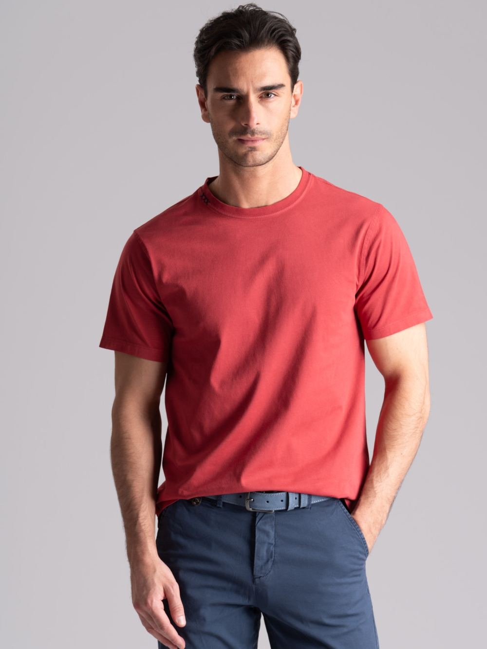 T-shirt uomo girocollo modello mezza manica, realizzata in fresco tessuto jersey 100% cotone con lavaggio old. Questa maglietta uomo è caratterizzata da puntoni applicati a mano sul collo, realizzati con filato di cotone di colore a contrasto rispetto al fondo della maglietta. La t-shirt uomo è disponibile in cinque varianti colore: blu, verde militare, cachi, grigio inox e mattone.